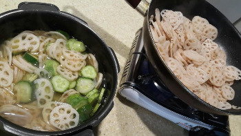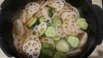 4. 연근과 오이를 담은 그릇에 끓인 피클 물을 부어준다.