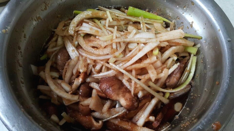 양파와 표고버섯, 배를 채 썰어서 섞어 주세요.