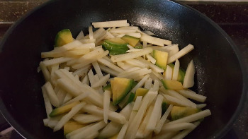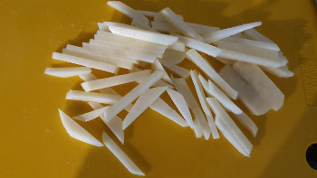 주방칼 사용으로는 감자를 슬라이스하고 나눠주면 껍질을 돌려가면서 잘라낸다.