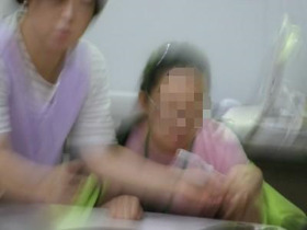 휠체어에 앉아 몸이 자유롭지 못하다.