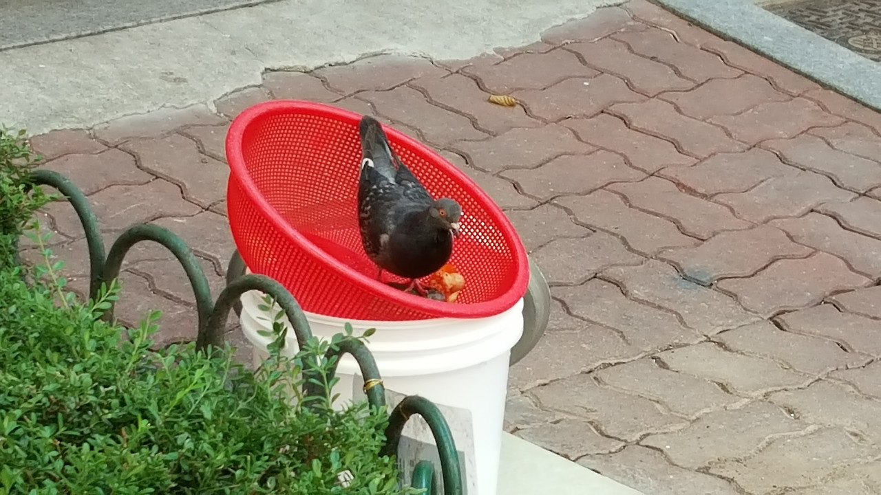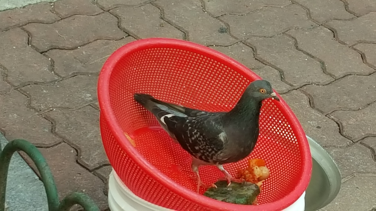 잔반 소쿠리에 비둘기가 앉았다.