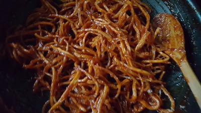 곱게 물든 오징어채를 한 줄기 올려 입으로 쏙~~ 맛을 본다.