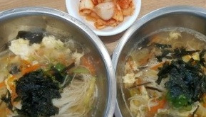 뜨거운 육수를 내고 갖은 고명으로 잔치국수를 만들어 먹는다.