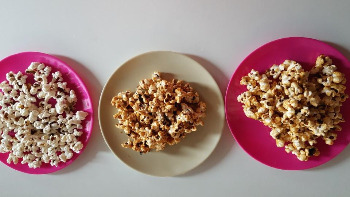 그릇에 튀긴 팝콘을 담고 시럽을 뿌려 골고루 묻히고