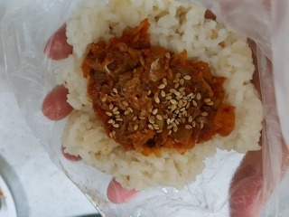 비닐봉지에 남은 밥을 넣고 밥을 납작하게 펼칠 후 가운데 볶은 김치를 넣어 동그랗게 주먹밥을 만든다. 비닐의 모서리를 이용하여 삼각형 모양을 만들고 삼각김밥용 김 위에 삼각형 모양의 밥을 올린후 비닐 김의 아래부분으로 밥을 덮은 후 양 모서리를 접어 넣어 스티커를 붙이는 일이다. 여기서 나를 부르는 참여자들이 많아졌다. 한 분씩 한분씩 순서대로 거들었고, 설명하고, 때로는 지켜 보는 동안 세 분의 참여자는 김밥용 김의 비닐까지 벗겨 김으로 밥을 감싸고 당황해 하고 계셨다.
