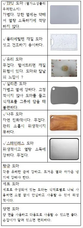 도마의 크기가 너무 작으면 식재료를 올려서 썰고, 자를 때 식재료가 도마 밖으로 나와 비위생적이다. 도마가 너무 크면 도마를 움직이고 옮길 때 무거워서 다루기가 어렵다. 그러므로 도마는 a4용지 두 장을 펼쳐 놓은 크기가 적당하며, 소독하기에 적합하도록 열에 강해야 하며, 가볍고 위생적이어야 한다.