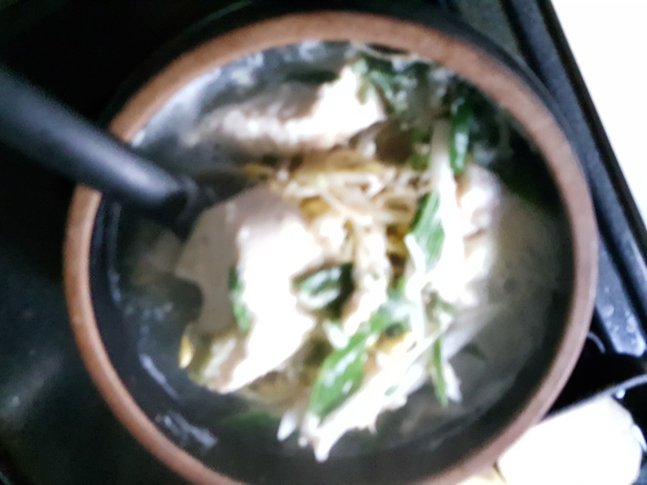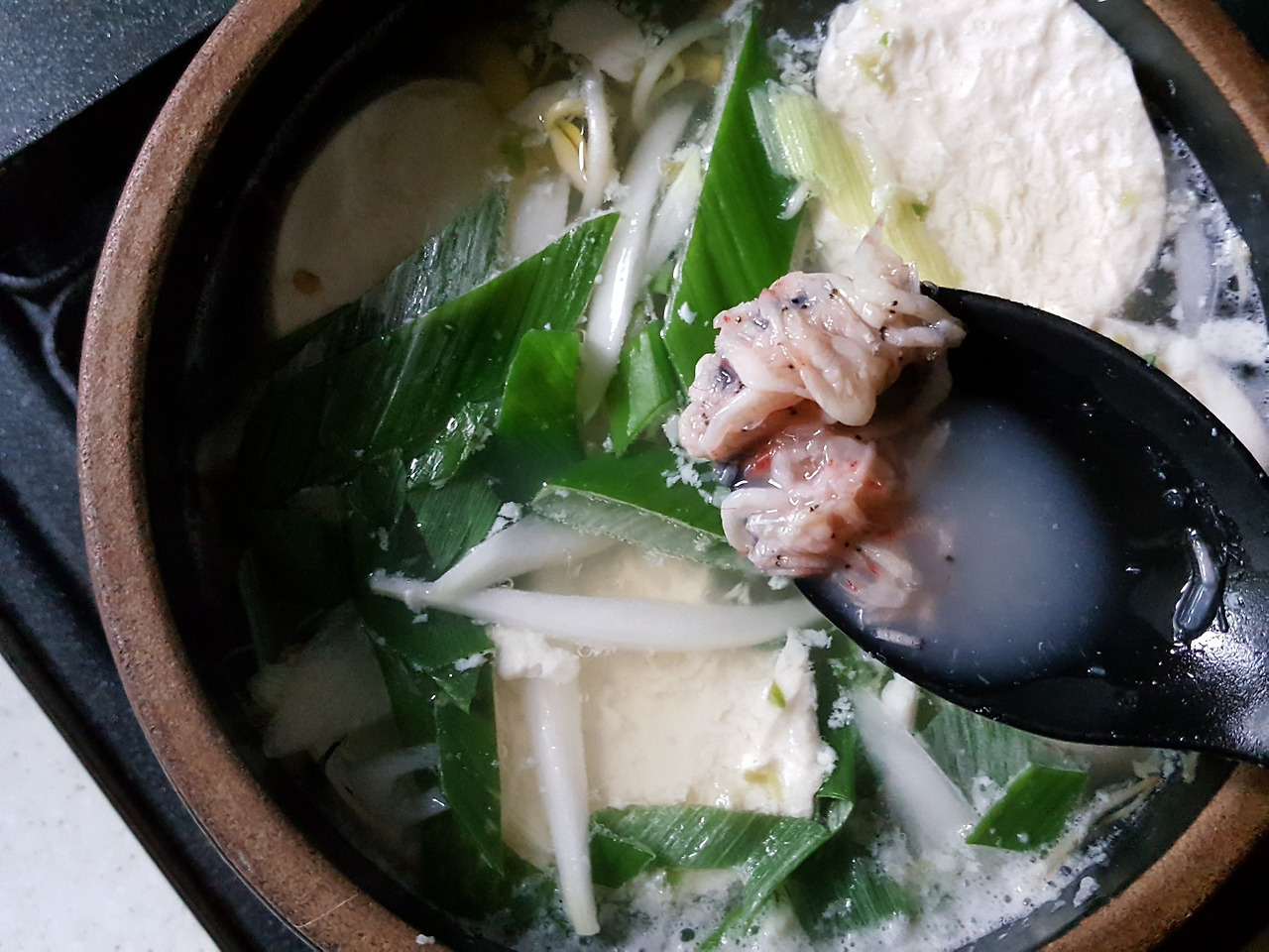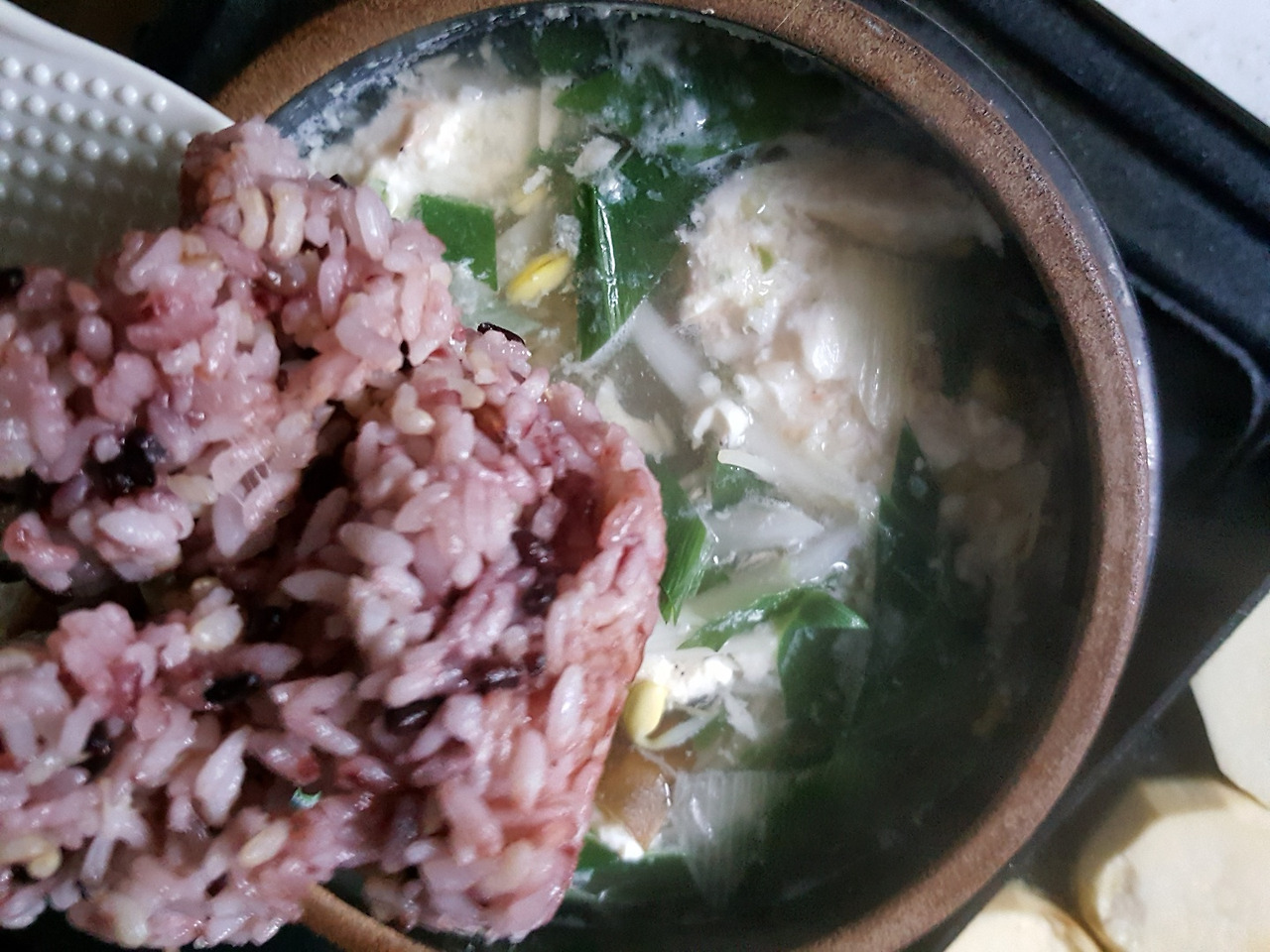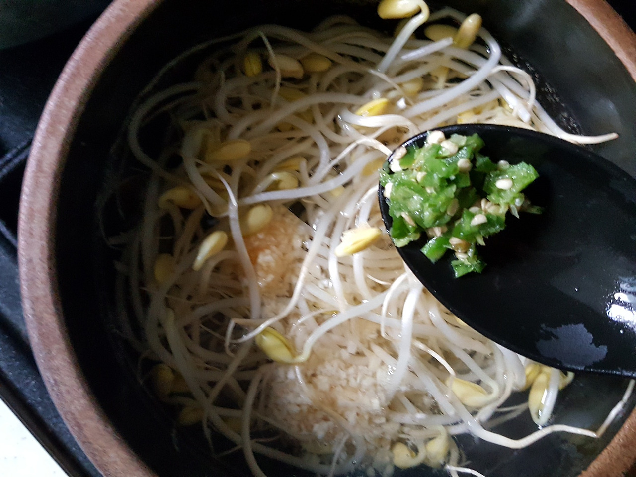 육수를 미리 만들었어야 되는데 만들어 놓은 육수가 똑 떨어졌다. 뚝배기에 맹물을 담았다. 다시마 두 쪽을 담아 불 위에 올려 끓였다. 처음에는 강 불로 끓이다가 끓고 나면 중약불로 조절한다. 그리고 냉장고에 있는 콩나물을 꺼내서 씻은 후 물기를 빼고 끓인 다시마 물에 콩나물부터 넣는다. 그리고 순두부 반을 넣는다. 양파도 조금, 대파도 조금, 청양고추도 조금, 그리고 다진 마늘은 푹 한 숟가락, 그리고 새우젓을 넣어 간을 맞춘다. 더 매콤하고 알싸하게 먹고 싶다면 청양고추를 더 넣거나, 빨간 국물을 먹고 싶다면 고춧가루를 푹 한 숟가락 넣는다. 나는 맑은 국물이 먹고 싶었기에 고춧가루는 넣지 않는다. 그냥 다진 청양고추로 알싸하게 먹지만 먹을 때는 매운맛 때문에 갑자기 훅 들어 마시지 말고 조심해야 한다. 콩나물의 비린내가 없어지고 순두부도 푹 풀어지면 찬밥 반 그릇을 넣는다. 갓 지은 밥을 넣으면 죽처럼 퍼지기도 하지만 꼬들거리는 식감이 없기 때문에 갓 지은 밥보다는 찬밥이 좋다. 요즘 시판되는 햇반은 전자레인지에 데우지 말고 그냥 넣으면 된다. 그리고 밥 위에 달걀 하나 톡하고 깨뜨려 올리면 그야 말로 식당에서 사 먹을 수 있는 콩나물국밥이 된다.