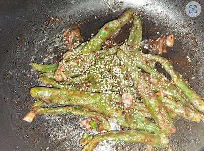 밀가루를 뽀얗게 뒤집어 쓴 고추를 찜기에 올려 쪘다. 하얀 밀가루가 투명해 지면 집개로 꺼내면 된다. 고추는 생으로도 먹기 때문에 살짝 쪄야 아삭한 식감이 살아 있다. 고추의 양이 많지 않기에 김이 나기까지 한 5분을 찐 것 같다 얼마 동안 찌느냐보다 생 밀가루가 아니면 된다.고추의 색깔이 초록초록하다. 뜨거운 김이 날아가도록 고추를 접시에 담는다. 고추가 식을 동안 양념장을 만든다. 고추가루 1. 다진 마늘 1/2. 간장 1. 맛술1/2. 설탕 1/2. 참기름 1/2을 넣는다. 고추에 양념장을 넣고 섞는다.통깨를 넣어주면 꽈리고추찜, 또는 꽈리고추무침이 완성 되었다.