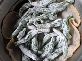 슈퍼에서 판매되는 많은 고추 중에 왜 잘 사지도 않는 꽈리고추를 집어 들었을까 싶다. 풋고추, 청양고추, 오이고추 등등, 그 중에서 청양고추와 오이고추를 주로 구입하는데 이날은 왜, 왜 꽈리고추를 집어 들었을까. 꽈리고추로 어떤 반찬을 만들어야 되겠다는 생각도 없었다. 그렇게 구입 한 고추는 야채실에서 하루, 이틀..... 4일 동안 숨죽여 있었다. 다른 야채들 속에서 밀리고 밀려 안쪽 구석진 곳까지 들어 가 있어 까맣게 잊고 있었다. 일요일은 냉장고 정리하는 날이다. 냉장고 정리하는 날에 발견 된 꽈리고추. 다행스럽게도 싱싱했다. 꼭지를 따고, 물에 씻고, 비닐봉지에 넣어 밀가루 한 숟가락을 넣어 마구마구 흔들어 준다. 이 흔들림에 초록의 고추는 하얀 가루를 뒤집어 쓰고 뽀얀 고추로 변해 있었다. 딱히 이 고추로 무엇을 만들겠다고 생각한 적도 없었기에 대개는 나의 경우에는 멸치 볶음에 넣거나, 어묵 볶음에 넣거나, 아니면 된장 끓일때 청양고추 대용으로 썰어 넣는게 이 고추의 쓰임이다. 그런데 토요일에 멸치볶음도, 어묵볶음도, 된장국도 다 끓였기 때문에 고추로 단독요리를 만들어 내야 했다. 깊이(?) 생각을 했다. 어떤 반찬을 만들어 내는데 이렇게 깊게 생각해 본적이 없는데... 말이다.