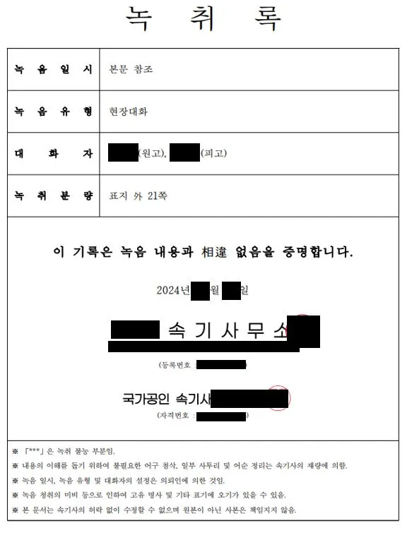 난 여태 녹취록이 녹음파일을 증거로 보내고 내용을 내가 간략히 요약해서 덧붙이면 되는 건 줄 알았다.