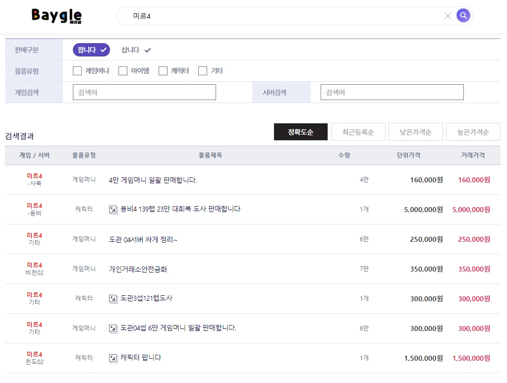 이렇게 P2E와 P&E 모델은 게임을 플레이하여 돈을 벌 수 있다는 개념이 핵심이라면, 이러한 컨셉은 사실 예전부터 있었습니다. 유저들은 굳이 인게임에서 벌어들인 가상화폐를 돈으로 바꾸지 않으면서도 이미 비가상화폐 게임을 플레이하면서 돈을 벌어 왔고 지금도 비블록체인 게임을 플레이하며 실제 돈을 벌고 있습니다. 이에 게임을 하면서 돈을 버는 개념은 사실 전혀 새로운 컨셉이 아닙니다. 온라인게임이 생겼을 때부터 이미 게임 토큰 또는 인게임 화폐가 존재하였으니, 벌써 1990년대부터 있었던 개념이네요. 그리고 이러한 인게임 머니를 실제 돈으로 사고팔 수 있도록 중개해 주는 플랫폼 회사 중 하나인 '아이템베이(현 베이글)'은 2001년에 설립되어 지금까지 사업을 하고 있습니다. 아래의 그림과 같이 위메이드의 <미르4>의 게임머니를 판매한다는 게시글들이 보이고 있습니다. 첫 번째 검색 결과 글을 보면 4만 게임머니를 한화 16만 원에 판매하고 있네요. 이러한 중개사들은 블록체인에 기반하지는 않습니다만 P2E와 P&E의 핵심적인 기능을 제공하죠.