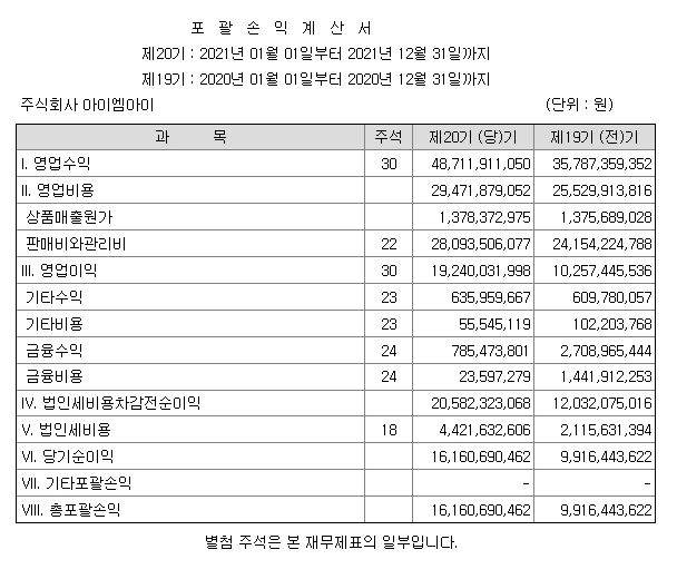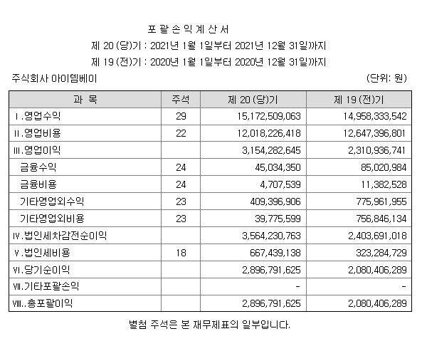 이러한 플랫폼 회사의 서비스가 얼마나 많이 사용되고 있는지 살펴보겠습니다. 아래의 자료는 인게임 재화 거래를 중개해 주는 아이템매니아와(아이엠아이) 아이템베이(베이글)의 2021년 포괄손익계산서입니다. 양사의 매출을 합하면 약 639억 원입니다. 그리고 이 매출의 출처는 아이템매니아와 아이템베이를 활용하여 게임머니를 판매하는 판매 유저들로부터 취한 수수료입니다. 다르게 표현하자면, 양사는 게임머니 판매와 구매를 중개하는 플랫폼이며, 게임머니 판매자에게 판매대금의 5%를 수수료로 가져가는 장사를 하고 있는 것이죠. 즉 양 플랫폼에서 거래된 현금의 총량은 2021년에 약 1조 2,780억 원이었다는 소리입니다. 아이템매니아와 아이템베이는 2021년의 판매대금 1조 2,780억 원에서 수수료 5%를 가져가 639억 원을 매출로 인식하게 되는 것이지요. 게임머니의 대가로 유저들이 현실 돈인 원화로 1조 2,780억 원 이상을 연간 지불하고 있으니 엄청 많이 쓰이고 있는 겁니다.