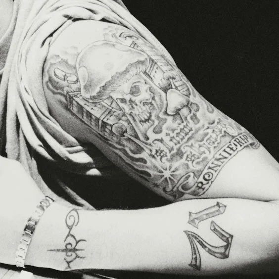 이에 에미넴은 로니가 죽고 나서 그를 기리는 목걸이를 자주 착용하며, 몸에는 그를 기념하는 문신도 새겼습니다. 아래 에미넴의 왼팔을 자세히 보면 "RONNIE RIP"라고 되어 있는 것을 볼 수 있습니다: