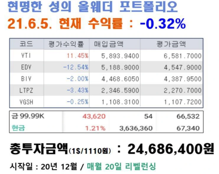 21년 6월 5일 기준, 포트폴리오 성적은 -0.32%였습니다. 지난 주에 100만 원을 투자하면서 6월 리벨런싱을 진행했습니다.