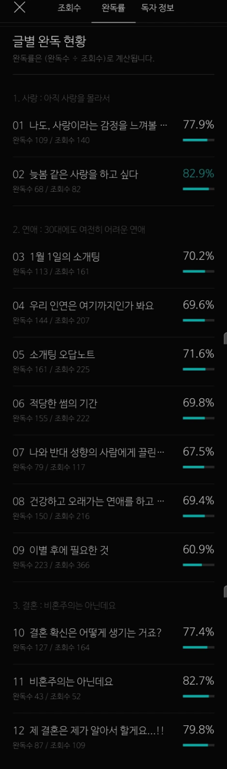 완독률은 조회수 대비 완독수의 비율로 계산되는데 이 수치를 통해 어떤 글이 독자들에게 와닿았는지 알 수 있다. 혼자 보는 일기장 속의 글이 아닌 이상 모든 글은 독자를 염두에 두고 쓰기 마련이다.