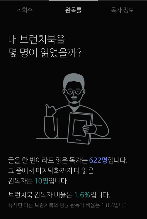 따라서 완독률이 낮은 경우 그 이유에 대해 생각해볼 필요가 있다. 분량이 너무 많은 건 아닌지, 가독성이 떨어지거나 공감되지 않는 내용인 것은 아닌지, 다양한 측면에서 원인을 찾아봐야 된다. 이를 토대로 부족한 점을 보완하여 다음번에는 보다 나은 글을 쓸 수 있을 것이다.