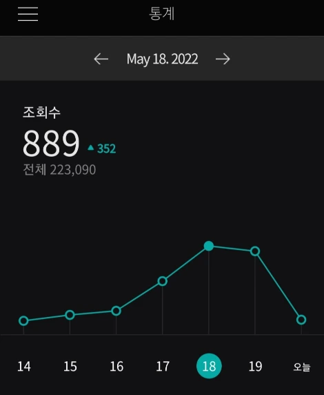 그래프를 보면 17일부터 갑자기 조회수가 늘어났는데, 아마 이날부터 브런치북이 소개되었다고 추측해볼 수 있다. 조회수는 18일에 최고점을 찍고 다시 내려가는 중이다.