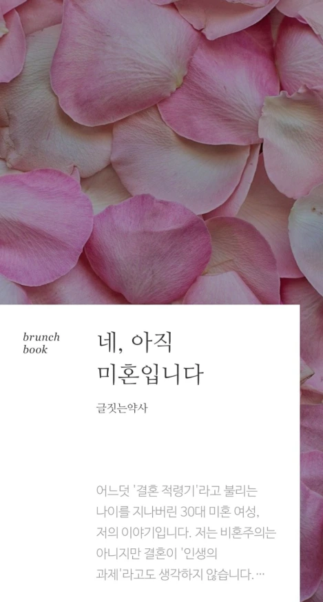 이 브런치북은 어느덧 '결혼 적령기'라고 불리는 나이를 지나버린 30대 미혼여성인 나의 이야기이다. 20대와 30대를 보내며 경험한 썸, 연애, 이별의 경험을 솔직하게 풀어냈고 결혼에 대해서도 나름 깊이 있게 고민한 결과물을글로 써보았다.(대체 결혼 적령기라는 단어는 누가 만든 건지, 왜 모두가 비슷한 시기에 결혼을 해야 되는 건지는 모르겠지만..)