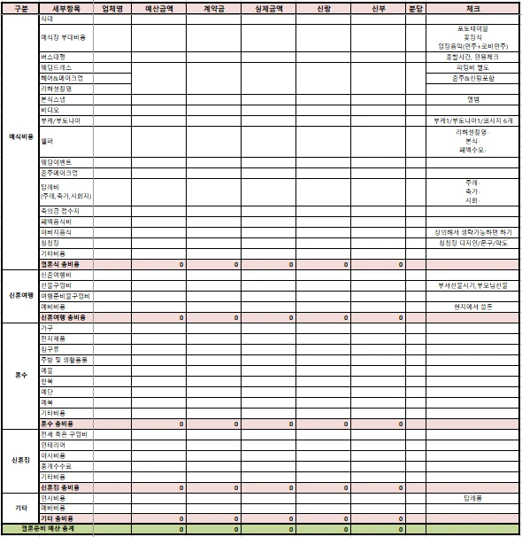 신랑 신부는 모든 사항을 워킹으로 여러 업체를 비교해보고 선별하여 모든 계약을 끝냈다. 스튜디오에서 진행하는 리허설은 예약하지 않았고, 본식에서 입을 드레스와 메이크업 그리고 본식스냅 사진을 좀 중점적으로 옵션을 정리하여 계약했다. 웨딩홀도 좋은 곳으로 예약했고, 대절 버스에 식사까지 알맞게 준비했다.