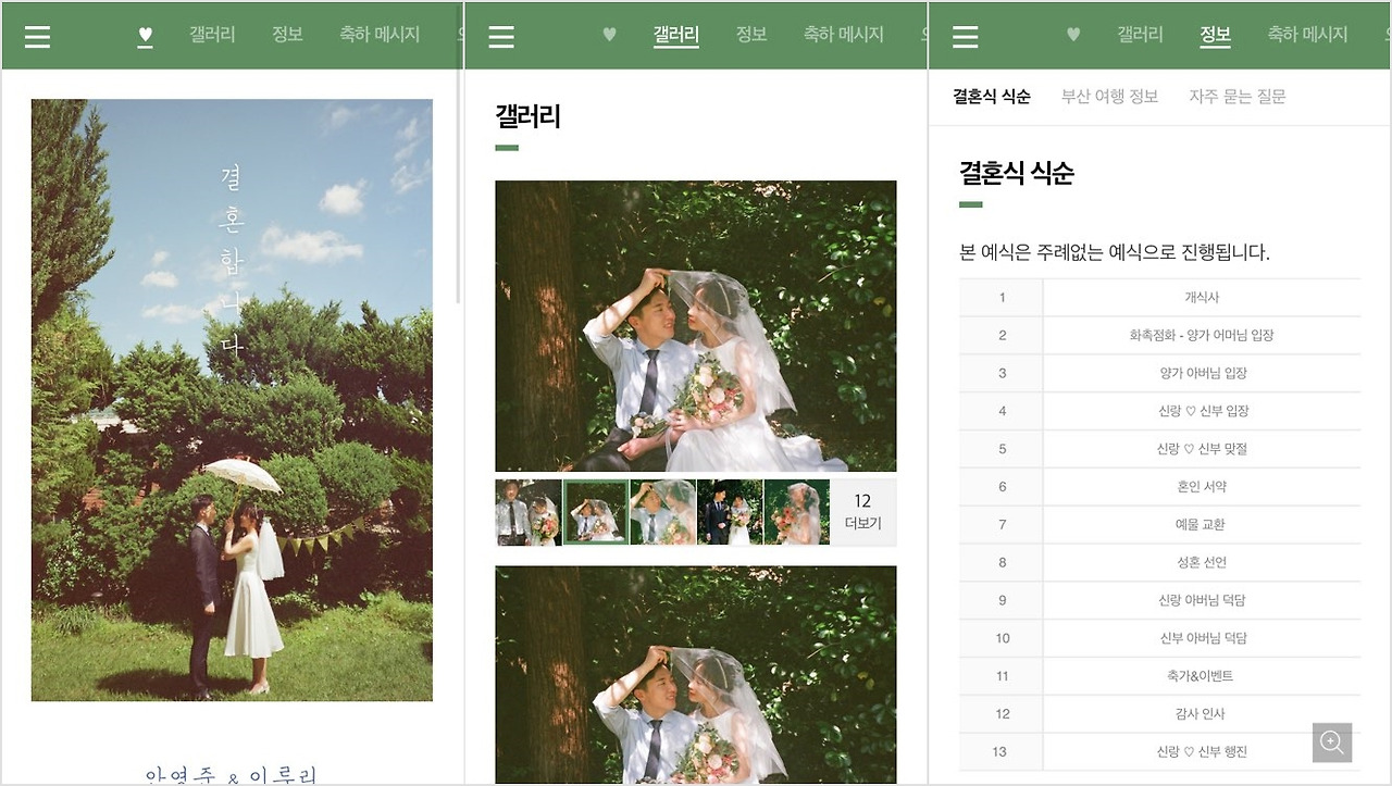 기존 모바일 청첩장과 달리 내 맘대로 메뉴를 구성할 수 있다. 주로 모바일 청첩장은 싱글 페이지로 제작되는 경우가 많은데 홈페이지다 보니 원하는 대로 메뉴를 넣고, 추가할 수 있다. 우리는 누구보다 많은 웨딩 사진을 첨부했고, 결혼식을 위해 부산까지 오는 하객을 위해 「부산 여행 정보」를 추가했다. 또한, 예식 하는 동안 지루하지 않도록 결혼식 식순을 하객들이 볼 수 있도록 추가했다.