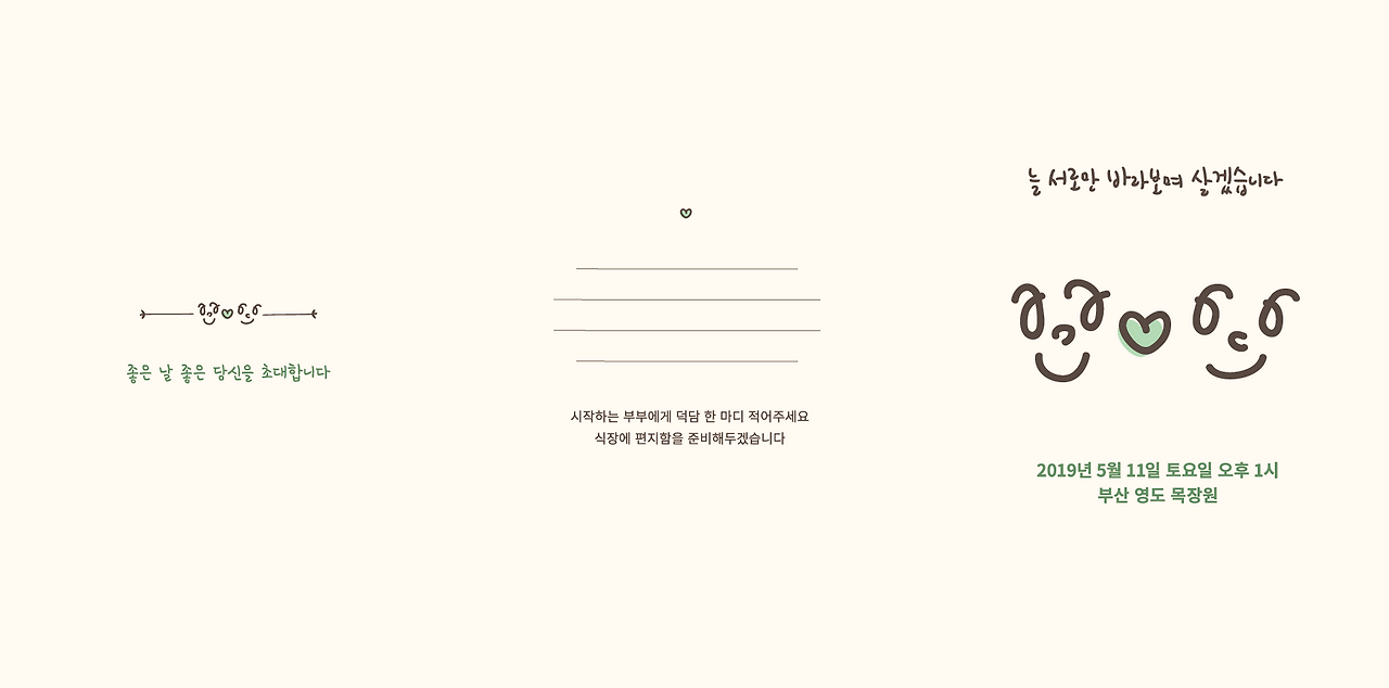 부산에서 결혼을 하다 보니 설명이 길어져 3단 청첩장으로 만들었다. 참고로 뒷면에 덕담을 적고 결혼식장에서 다시 넣을 수 있도록 기획했다. 결혼식 2달 전부터는 매주 약속을 잡고 청첩장을 나눠주러 다녔다.