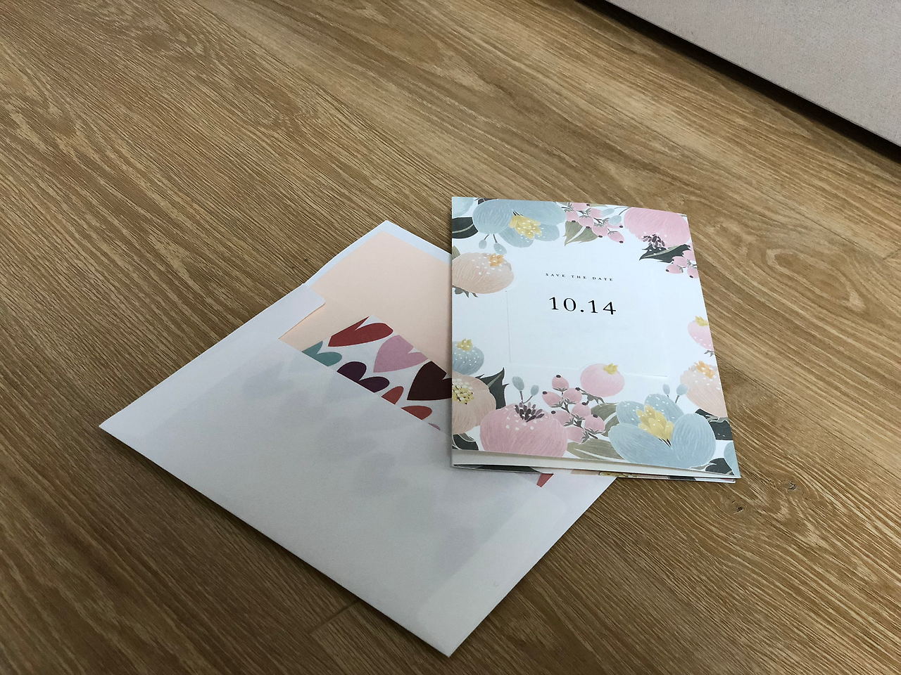 청첩장은 주로 결혼 3개월 전 제작해 2달 전부터 친구 및 지인, 은사님께 전해진다. 그나마도 ‘청첩장 언제 줄 거냐’는 말에 뒤늦게 만든다. 청첩장에 그렇게까지 큰 신경을 쓰고 싶진 않았는데 생각보다 너무 많은 신경이 쓰인다. 청첩장의 종이 재질부터 디자인, 심지어 글귀 작성 (선택) 및 내용이 틀리지 않았는지 모두 우리가 결정하고 확인해야 한다. 우선 글귀는 바쁜 신랑신부를 대신해 업체는 예시 문구를 몇개 알려준다. 거기서 고르면 된다. 하지만 종종 나처럼 글이 특별했으면 하고 바라는 이들은 문구를 그대로 사용하지 않는다. 최소한의 단어를 바꿔서라도 청첩장 문구를 작성한다. 이왕 청첩장을 만드는 데 있어 종이도 꽤 좋았으면 싶다. 1장에 600원짜리 청첩장과 복잡한 레이저 커팅을 통해 제작되는 2천원짜리 청첩장엔 큰 차이도 있는 것 같다.