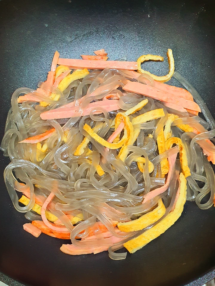 냉장고 안에 있는 햄과 어묵을 꺼내서 가늘고, 길게 썰어서 한쪽에 뒀다. 당면이 끓을 때까지 기다렸다가 당면이 익고 나서 우선 팬에서 건져서 서로 달라붙지 않게 물로 살짝 헹궈서 한쪽에 담아뒀다. 그리고 사용했던 팬에 기름을 살짝 둘러서 썰어 놓은 어묵과 햄을 강한 불에 잘 볶아줬다. 이렇게 볶아주던 햄과 어묵이 어느 정도 익었을 때 삶아뒀던 당면을 볶고 있는 햄, 어묵이 있는 팬에 함께 넣어 다시 한번 불에 볶아줬다. 이때 물을 살짝 부어서 당면이 조금 더 익게 볶은 뒤에 내놓을 그릇 안에 잘 담고, 샐러드용으로 사용하는 야채를 그 위에 올려놓았다. 야채까지 세팅이 끝나면, 양념장인 초장을 뿌리고 조금 더 고소하게 깨까지 뿌려서 요리를 내놓았다.