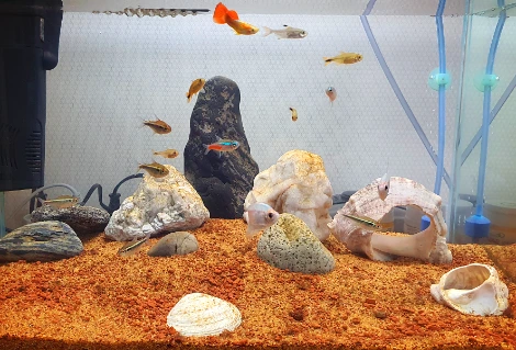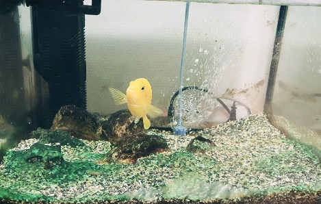 처음 왔을 때는 치어일 때 와서 어른 새끼손가락 한마디 정도 크기였는데 지금은 어른 손바닥 반만큼 컸어요. 처음엔 합사 어종을 몰라서 시클리드 10여 마리와 다른 열대어를 넣었다가 끔찍한 일을 겪었죠. 시크리드가 커가면서 공격성이 강해졌고, 이유도 모른 채 함께 키운 테트라 종류가 죽어 나가기 시작했고, 시간이 지나서야 함께 합사 하면 안 되는 걸 알고 부랴부랴 시클리드 어종만 분사하여 키울 어항을 추가 구매했죠.