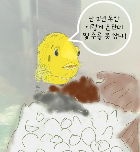 성격이 공격적이라 다른 물고기와 합사가 어려워 아래 사진처럼 어항을 따로 분리해서 다른 종과 분리해 키우고 있어요. 요즘은 녀석도 늙었는지 자주 배 깔고 바닥에 엎드려 있는 모습을 자주 봐요. 마음은 아프지만 녀석에겐 그리 긴 시간이 남지는 않은 거 같아요. 그래서 기념 삼아 이렇게 드로잉을 해 봤어요. 딸아이가 옆에서 영정 사진으로 쓰려고 그리냐고 묻더라고요(하하). 생을 마감하면 녀석을 묻을 묘 자리도 봐놨어요. 흙으로 돌아가는 게 좋을 것 같아서 아내가 열심히 가꾸는 아파트 화단에 묻을 생각이에요.