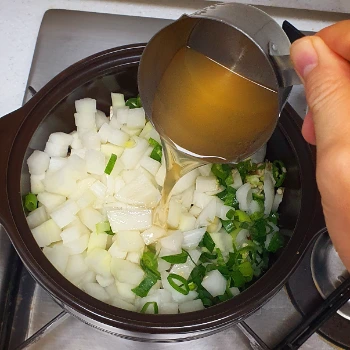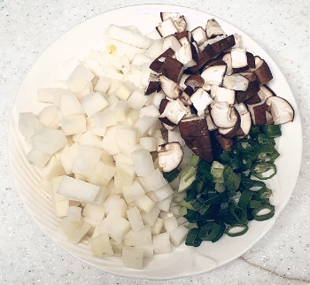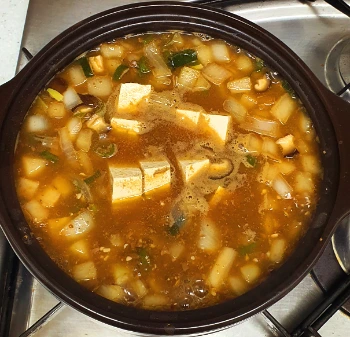 특별히 요리 재료를 준비하지 않았을 때 전 종종 냉장고를 뒤져 이것저것 찾아내서 조리하는 걸 좋아해요. 그래서 오늘도 일명 '냉장고 파먹기' 신공으로 냉장고를 뒤져 보니 무, 양파, 청양고추, 두부 조금, 대파, 표고버섯이 있더라고요. 야채들은 아래 사진처럼 밥에 비며 먹을 크기로 깍둑썰기 하고, 어제 잔치국수 한다고 아내가 미리 내어놓은 멸치육수를 조금 썼어요.