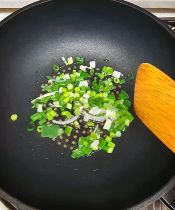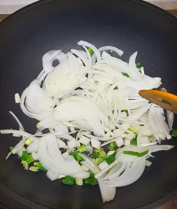 달궈진 팬에 포도씨유를 두르고 썰어놓은 대파를 넣어 잘 볶아주세요. 파 기름이 나올 정도로 센 불로 볶아준 뒤 채 썬 양파를 넣고 센 불로 30 ~40초 정도 볶아주세요. 양파가 기름을 먹고 볶아졌다 싶을 때쯤 손질해 놓은 버섯을 넣어 2분간 더 볶아주다가 중간 불로 줄인 다음 양념장을 넣어 볶아주세요. 조금 더 매콤하게 먹고 싶은 분들은 청양고추를 가늘게 채 썰어 양념장을 넣을 때 함께 볶아주시면 돼요.