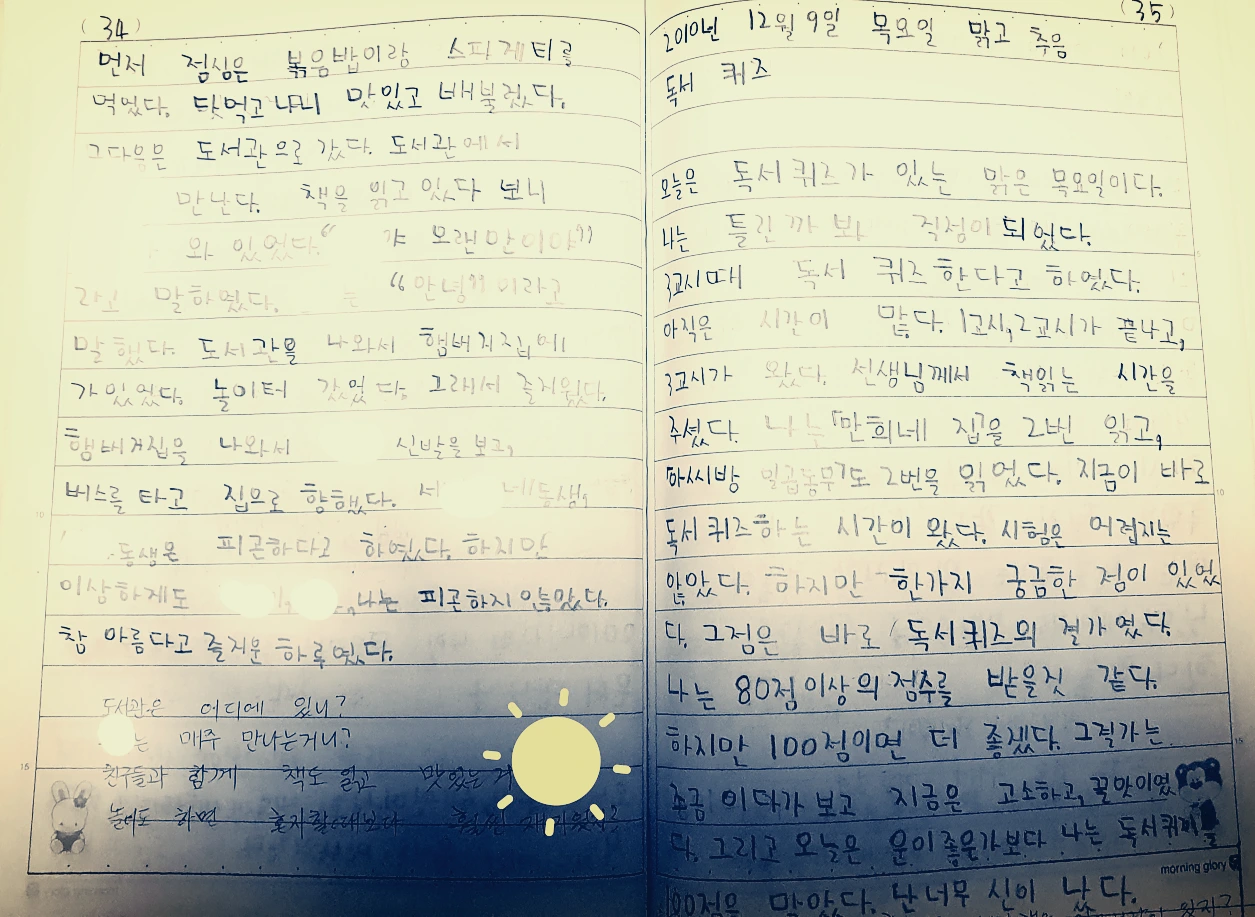그렇게 읽고 아들의 책상 옆 책꽂이에 살포시 꽂아 놓았던 일기장을 아들이 학원 간 오늘 저녁에 조용히 다시 펴 보았다. 10년 전 아들의 하루가 다시 오버랩되며 입가에 미소가 지어지는 것이 느껴졌다. 잠시 침대에 걸터앉아 아들의 일기를 더 들여다볼 때쯤 방으로 따라 들어온 딸아이가 따뜻한 추억 속에 있던 나를 끄집어냈다.