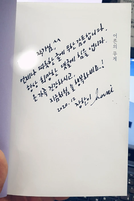이런 감사한 작가님들 중에서도 올해 제게 의미 있는 인연이 있는 작가님이 계세요. 우연한 기회로 작가님(이드id)의 글을 한 편 보게 됐고, 그렇게 하나의 매거진을 하루에 많게는 세, 네 개 적게는 한, 두 개의 글을 읽으면서 작가님의 팬이 됐죠. 이번 12월에 출간한 책까지 이미 4권의 책을 출간한 중견작가이고, 글결이 제게 너무 많이 와 닿았죠. 브런치에는 제가 흉내 낼 수 없는 글을 쓰시는 작가님들이 많이 계시지만 제가 읽어본 글들 중에서는 제가 담고 싶은 글결을 가지고 계세요. 이렇게 여러 편 글을 읽으며 소통을 하기 시작하고, 구독을 하면서 작가님도 제 글에 관심을 가지게 되었죠. 그렇게 서로 구독자로서 글을 읽고, 응원하는 사이가 됐어요. 그러던 중 얼마 전 제게 브런치 제안하기로 작가님의 메일이 왔고, 12월에 출간된 작가님의 책(어른의 무게)에 작가님의 친필을 담아 선물해 주셨어요. 너무 감동이었죠. 이드id 작가님 감사해요. 앞으로도 꾸준히 소통하고, 응원하며 지냈으면 좋겠어요.