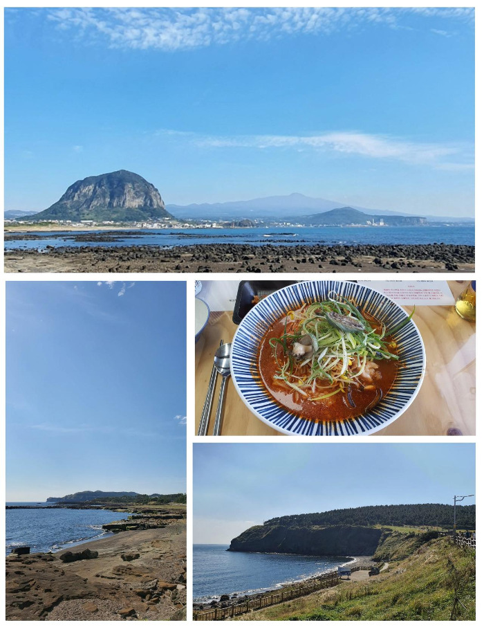 송악산을 오르기 전 남아있는 길 위에는 내 뱃속 허기를 채울 곳이 없을 것 같아서 길 위에 보이는 식당을 찾아 들어갔다. 시원한 맥주 한잔과 얼큰한 해물라면으로 제주의 첫맛을 감상하고 나서야 허기졌던 배와 10월의 뜨거운 햇살의 더위를 식힐 수 있었다. 아득히 보이는 산방산이 마치 지나왔던 길지 않았던 시간만큼이나 멀어져 가있는 듯 보인다. 흘렸던 땀에 젖어있던 옷이 마를 때쯤 잠깐의 꿀맛 같은 휴식을 뒤로하고 다시 길 위로 나섰다.