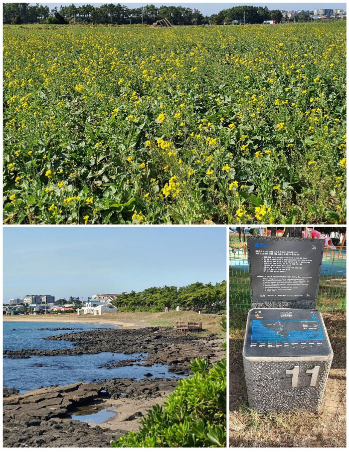 2Km가 남지 않은 거리를 한 걸음에 걸어가면서 눈에 보이는 해안길 위에 집들이 자연과 잘 어우러진 우리 사는 모습 같다. 마지막 길을 조금 더 가면 마지막으로 바다가 없는 길 위에 제주 특유의 검은 흙밭들이 돌담을 따라 옹기종기 모여있고, 심어져 있는 생명들에게 쏟아지는 스프링클러의 물 채는 소리가 경쾌한 음악소리같이 들린다. 시월 하고도 마지막 주임에도 유채꽃 만발하게 핀 모습을 보면서 마지막 발걸음에 힘을 더 보태본다.