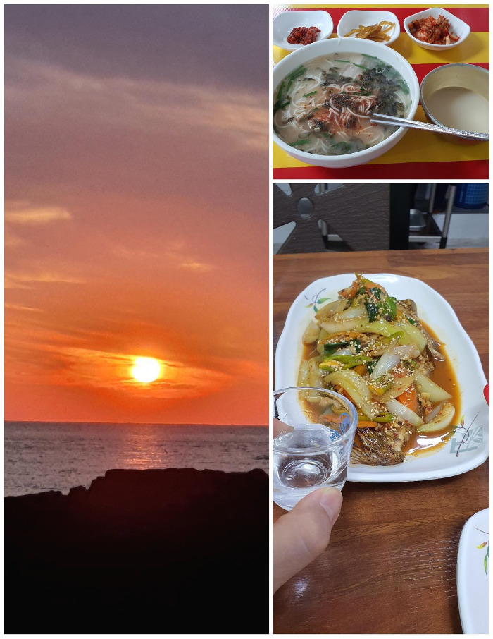 그렇게 이십여분을 지켜보고 나서야 하루를 밝게 비췄던 해는 오늘 할 일을 다 한 것이 뿌듯했는지 아주 작은 붉은 여운만 바다에 남겨놓고 모든 자취를 감췄다. 까무룩한 제주 올레 위에서 저무는 해를 이렇게 지켜보는 것도 오늘이 처음인 듯하다. 내일 길 위에서 다시 만날 새로운 제주가 기다려지기에 오늘 하루 잘 걸었다고 토닥토닥하며 하루를 끝낸다. 마음이 조금 아쉬웠는지 아니면 흘러가는 제주의 시간이 아쉬웠는지 늦은 시간에 다시 모슬포항 식당가에 나와 이곳저곳을 들여다보며 혼자 소주잔을 기울일 곳을 찾았다. 다른 식당에 비해 손님이 적은 어느 식당 앞에 멈춰 서서 '그래 오늘은 너로 정했다'라고 마음을 먹고 난 식당으로 들어섰다. 갈치조림 대신 꽃돔 조림. 식당 사장님의 강력 추천으로 살 많고 적당히 짭조름한 녀석을 안주 삼아 소주잔을 기울여본다. 줄어드는 소주병의 술처럼 오늘 남은 시간도 차츰차츰 줄어들고 있었다.