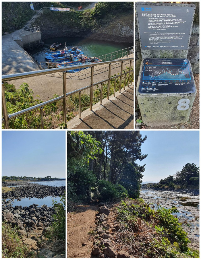 길 위에서 처음 마주한 곳은 월평포구와 강정포구였다. 작은 두 개의 포구에는 포구만큼이나 작은 몇 대의 배만이 가지런히 정박되어 있는 모습이 눈에 들어왔다. 포구와 포구를 잇는 올레길은 좁았지만 정감이 가는 바닷길이었고, 군데군데 밟히는 바다 해안 돌들이 올레의 멋스러움을 여행자에게 안겨준다. 나도 그냥 지나쳐가지 못하고 멈춰 서서 올레만의 느림과 여유로움을 잠시 만끽하고 발걸음을 다시 돌린다.