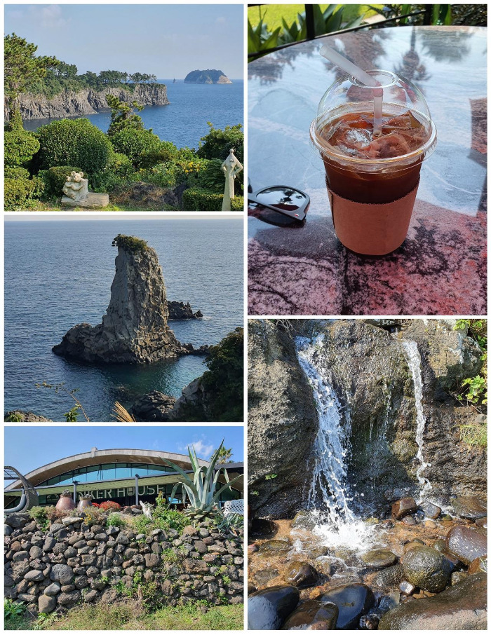 점심을 먹고 나선 길 위에는 7코스가 가장 사랑받는 이유가 눈앞에 펼쳐졌다. 이어지는 해안선을 따라 이어진 길은 바로 수봉로였고, 이국적이고 자연 그대로의 길을 고스란히 보여주는 길이여서 걷는 내내 아무 생각을 하지 않게 만드는 묘한 매력이 있었다. 그렇게 수봉로를 경유해 지나다 보면 깎아지른 절벽을 절경에 품은 돔베낭길이 나왔다. 길을 걷다 잠시 절경을 정면에 품은 카페에 들러 시원한 아이스 아메리카노 한 잔으로 다시 10월 제주의 뜨거운 태양을 피하며, 땀을 식혔다. 그늘 아래 시원한 커피 한잔과 바다에서 불어오는 바람에 달아올랐던 몸은 어느새 조금씩 식어갔고, 정면에 보이는 절경 너머에 곧 펼쳐질 외돌개의 풍경을 볼 생각에 잠시 늦췄던 걸음을 다시 내디뎠다. 걷는 걸음마다 시선은 바다 쪽을 향할 수밖에 없었고, 머리 높이 솟아있는 우거진 나무숲 덕에 한낮의 더위는 이미 잊은 지 오래였다. 앞으로 나갈 때마다 바뀌는 해안선의 풍경이 익숙해질 때쯤 바다 한복판에 우뚝 선 '외돌개'가 나오고 그 웅장함과 경이로움에 자연스레 턱이 벌어지고, 탄성이 나왔다.