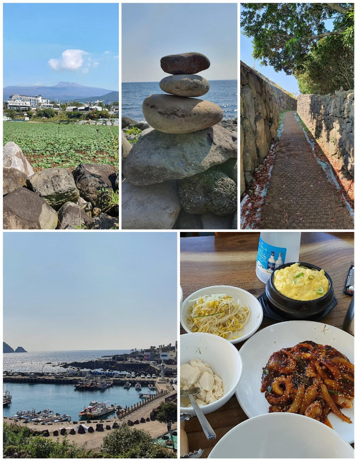 정오를 즈음해서 마주한 곳은 점심을 먹고 잠시 쉬었다 가려고 한 장소인 법환포구였다. 길 위에서 만나기 쉽지 않은 조금은 큰 마을이다. 조용한 포구는 아니었지만 제주 바다만의 낭만과 아름다움은 고스란히 갖고 있는 모습이었다. 이곳저곳을 둘러보다 들른 식당은 언덕 위에 있는 제법 손님으로 북적이는 식당이었고, 여러 가지 메뉴들이 있었지만 1인분이 가능한 식사는 낙지 비빔밥이 전부였다. 한 시간 가까이 한 걸음에 내달은 법환포구까지 온 길에 땀도 많이 흘렸고, 갈증도 난 탓에 낙지 비빔밥에 막걸리 한잔이 간절했다. 막걸리 한 잔이 입에 담기고 조금은 달콤 쌉싸름한 맛은 어느새 내 목을 타고 들어가 시원함을 넘어서 개운함까지 주는 기분이다. 매콤한 낙지와 더없이 잘 어울리는 달콤한 맛에 잠시 쉼표를 찍었다가 금세 다시 난 길 위에 섰다.