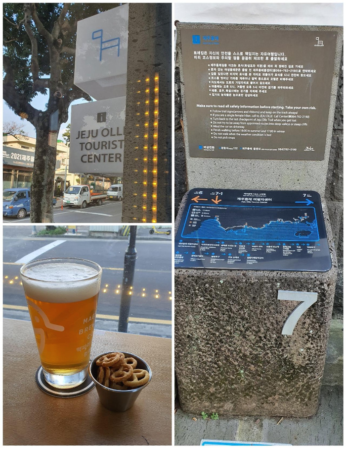 난 여행자 센터에 들어와 흘렸던 땀으로 젖어버린 옷을 갈아입었다. 그러고 나선 가볍게 나의 이틀간 여정을 별문제 없이, 즐겁게 마무리한 것을 자축하는 뜻에서 제주 맥주 한 잔으로 이곳을 기념했다. 한 시간여를 앉아있는 동안 많은 여행자들이 오갔고, 다들 자신들의 여정을 축하하고, 격려하는 모습이다. 다들 생김생김은 달랐지만 얼굴 가득 행복한 웃음만은 같은 모습이다. 이틀간의 여정에 많은 걸 비웠고, 많은 걸 담았다. 여행의 끝이 늘 아쉬움을 남기듯이 올레 여행을 마무리하는 내게도 그 아쉬움은 빗겨나가지 않는 것 같다. 다시 일상으로 돌아가야 하는 부담이 들지만 돌아갈 수 일상이 있으니 또 감사하고, 또 감사하다. 양쪽 새끼발가락이 검게 피멍이 들긴 했지만 마음 한가득 추억과 여유로움을 담고 간다. 이곳에 눈도장을 찍듯이 다시 한번 눈길을 주고서 몸을 일으킨다. 난 다시 일상으로의 복귀를 위해 공항으로 길을 나서야겠다.