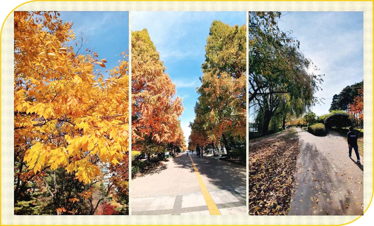 2021년 마지막 가을이 가는 것이 아쉬워 아내와 호수공원 산책을 나왔다. 가벼운 복장으로 산책하기에 좋은 코스임을 알기에 편한 복장, 편한 발걸음으로 우린 걷기 시작했다. 입동 절기에 어울리지 않는 포근한 주말 날씨였다. 연일 포근한 날씨가 이어졌어도 신기하게 나무는 계절의 변화를 알고 어느새 색동옷들을 갈아입었다. 그렇게 울긋불긋 그리고 노랗게 물든 나뭇잎들 사이로 올려다본 하늘이 시릴 정도로 파래 보인다.