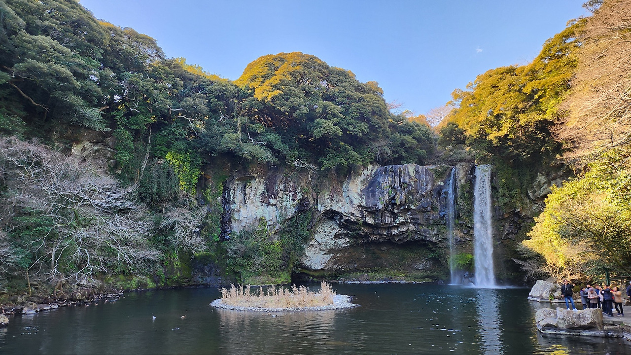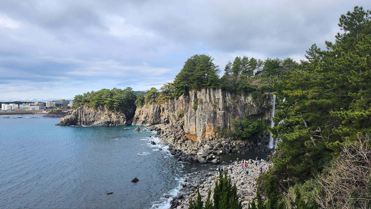 점심을 배불리 먹고 나서 다시 서귀포 도심으로 복귀했다. 이제 공항 출발 전 남은 시간은 두 시간 남짓이었다. 우리가 마지막으로 찾은 곳은 서귀포 도심에서 가장 자주 찾는다는 천지연폭포와 새연교다. 천지연폭포는 재작년 혼자 제주 올레 7코스를 걸으면서 칠십리공원에서 내려다봤던 기억이 났다. 주말이라 폭포를 찾은 관광객도 제법 있었지만 쌀쌀했던 날씨 탓에 붐비는 정도는 아니었다. 천지연폭포 앞에 서니 서귀포 도심에서 떨어지는 폭포여서 그런지 천연폭포라는 게 더 믿어지지 않을 정도의 큰 규모를 자랑했다. 마지막으로 제주 바다 바람맞으며 찾아간 곳은 새연교다. 새연교는 서귀포항의 랜드마크이며, 그 구조자체도 특이하지만 차량 출입이 불가한 최장 보도교이다. 다리를 건너며 멀리 수면 위를 반짝이는 윤슬이 장관을 이룬다. 다리 끝에서 보이는 섶섬, 문섬과 범섬도 이곳에서 보이는 자랑 중에 하나다.