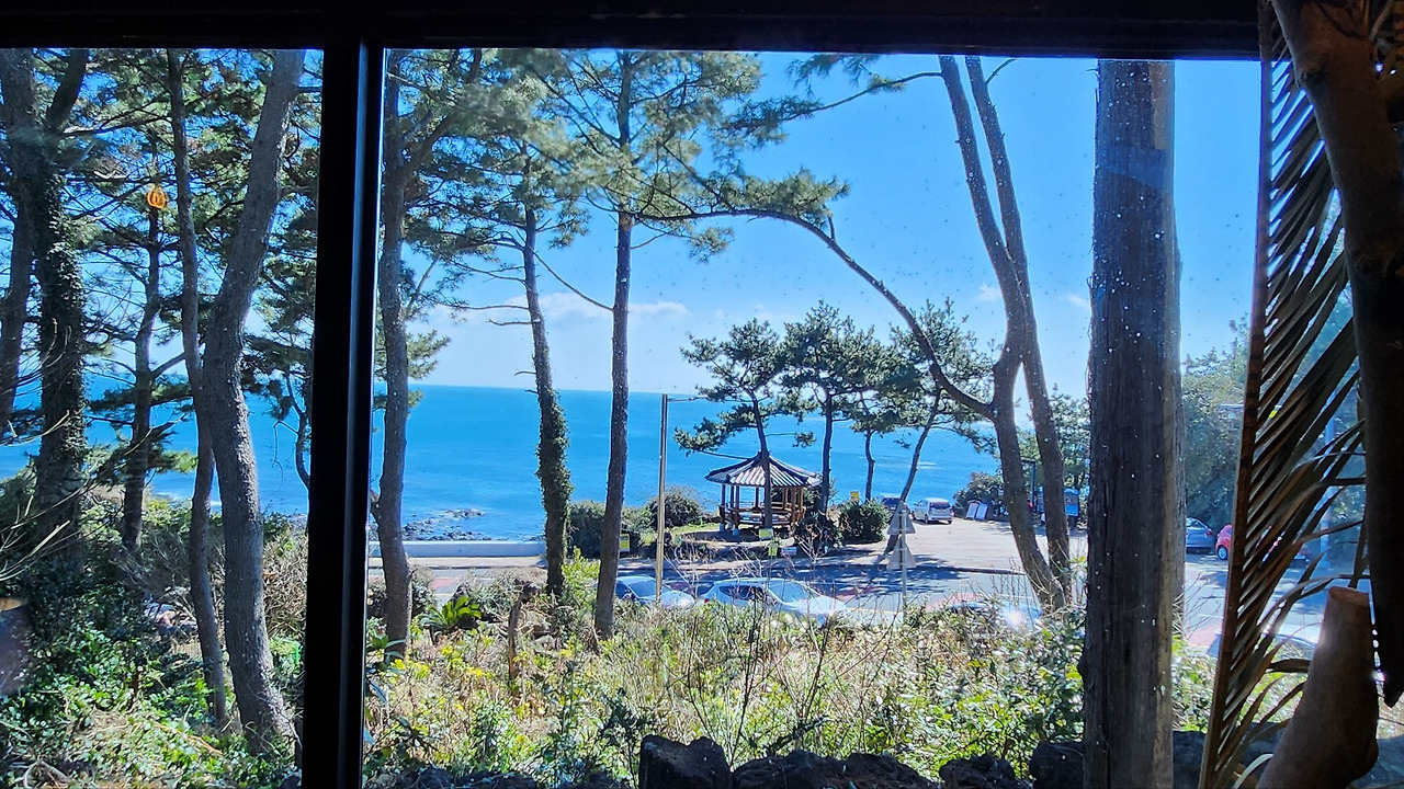 로빙화 내부에서 바라본 바다 전경(우측)과 천지연폭포(우측)