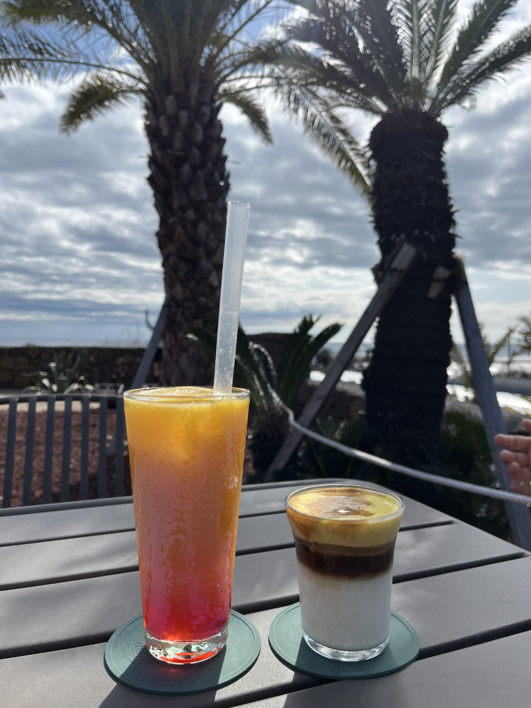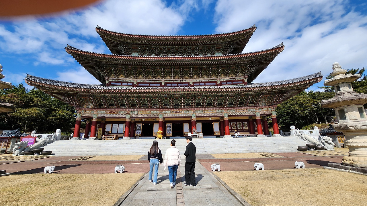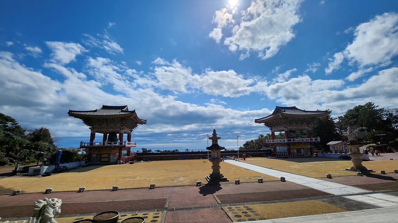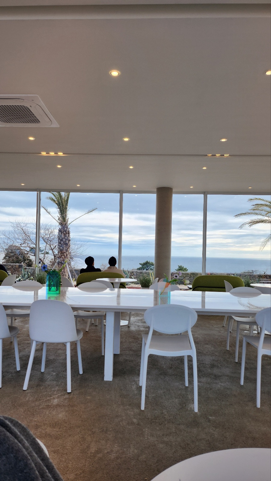 오전을 걸어서 이동했다면 오후에는 동양 최대 사찰인 약천사를 찾았다. 서귀포 시내에서 약 20분 택시를 타고 나간 거리에 있었다. 입구부터 압도적인 사찰 규모에 깜짝 놀랐다. 아기자기한 작은 암자나 사찰을 좋아하던 아내나 내게는 3층 규모의 대웅전과 압도적인 대웅전 불상에 숙연해지기까지 했다. 군데군데 껴있던 먹구름이 어느덧 걷치고 맑은 해가 나오자 대웅전에서 내려다본 풍경은 동남아 같은 이국적인 모습이었다. 사찰 여기저기를 구경하고 나서 '뷰(View)' 맛집을 찾아 이동했다. 약천사에서 걸어서 10분 거리에 사면이 창으로 된 예쁜 카페가 있었다. 자릴 잡고 비싼 음료값 치른 값어치를 채우기 위해 여기저기 사진을 찍었다.