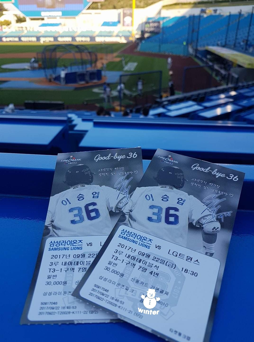 경기가 끝나고 잠시 이승엽 선수가 인사를 하러 나왔고, 난 앞으로 현장에서는 '저 전설의 선수'를 보지 못하겠구나 하는 아쉬움과 한국 야구에 큰 발자취를 남기며 긴 시간 많은 팬들을 웃고, 울게 했던 감사함에 복잡한 감정으로 그를 바라봤고, 진심 어린 격려의 박수로 그를 보냈다. 그 날의 경기 결과는 대구 홈까지 찾았던 나에게는 아쉬운 패배였지만, 경기 결과와는 무관한 큰 감동과 멀지 않은 미래에 은퇴를 바라보는 나에게 새로운 시선으로서의 의미를 보여줬다.