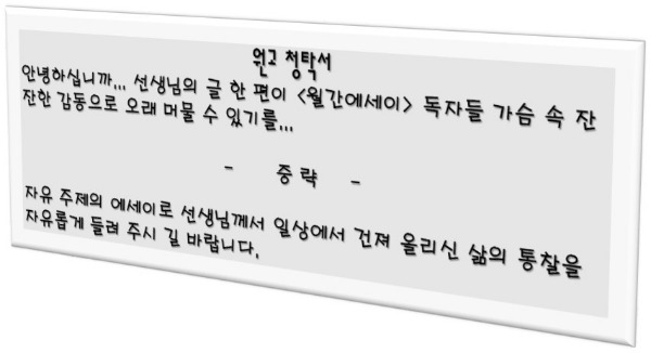 계절이 두 번이나 바뀌어 어느덧 겨울의 문턱에 들어선 11월 말, 오매불망 기다리던 『월간에세이 12월호』가 배송되었다. 빳빳한 새 책의 질감을 느끼며 떨리는 손으로 목차를 펼쳤다. 내 이름 석 자와 글 제목이 선명하게 박혀 있었다. 모니터 화면 속에서만 존재하던 활자들이 종이라는 물성을 입고 세상에 나온 것을 확인하는 순간 쓸 때와는 또 다른 묵직하고도 깊은 즐거움이 밀려왔다. 나는 조용히 찾아온 이 서프라이즈 선물을 거실 책장 가장 잘 보이는 곳에 세워뒀다. 오며 가며 눈길을 줄 때마다 새어 나오는 웃음을 한동안 만끽하기 위해서다.