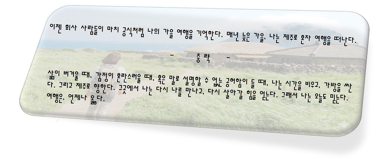 반가움과 기쁨이 교차하는 한편, 묘한 책임감이 어깨를 눌렀다. 편집장이 이 지면에 어울리는 필자를 찾기 위해 들였을 수고와 책정된 원고료의 무게가 느껴졌기 때문이다. 하지만 마감까지 한 달이라는 넉넉한 시간, 그리고 무엇보다 주제가 자유라는 점이 나를 안도하게 했다. 잘 모르는 분야를 억지로 꾸며낼 필요 없이 내가 가장 편안하게, 그리고 진솔하게 풀어낼 수 있는 이야기를 쓰면 됐다. 머릿속에 내가 좋아하는 단어들이 떠올랐다. 여행, 쉼, 그리고 언제나 그리운 섬, 제주도.