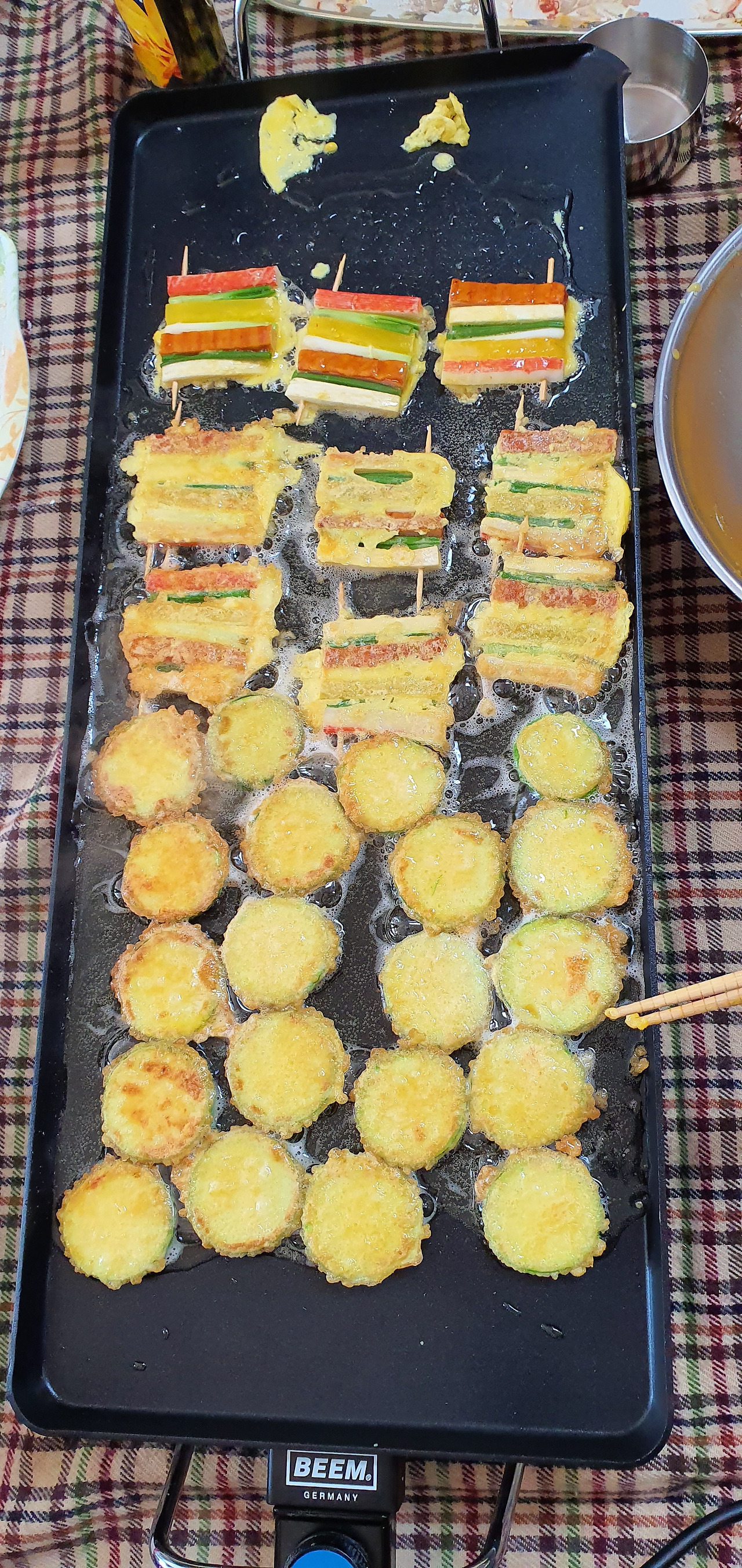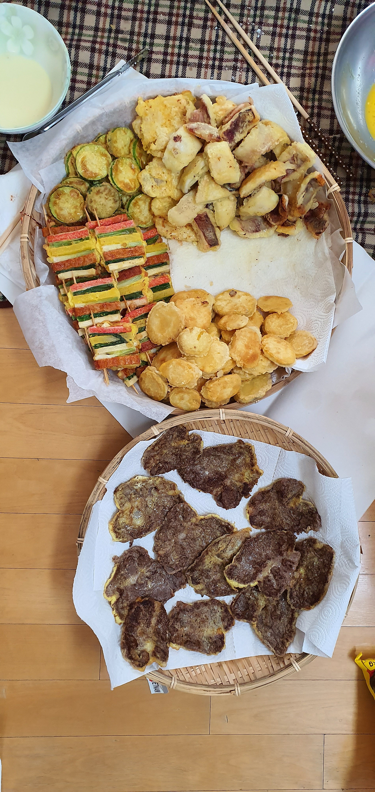 차례차례, 하나하나 장을 다 보고 나서 명절 이틀 전 저녁부터 아내는 나물국 할 준비를 하기 시작했고, 나도 미력한 내 손과 마음이라도 명절 준비하는 아내 손을 거들려고 산적을 미리 꿰어가며 동동거리며 애는 써 보긴 했지만, 아내의 마음에는 그리 크게 차지 않았을 것이다. 명절 전날 아침을 먹고 나서 우리 네 식구는 모두 아내의 호출과 명령대로 일사불란(?)하게 움직이며 명절 준비에 돌입했다. 아내가 썰어놓은 호박, 고구마와 냉동 동태, 오징어, 쇠고기 등을 전을 하기 위해 부침가루 반죽을 묻히고, 아내의 진두지휘 아래 전을 굽기 시작했다.