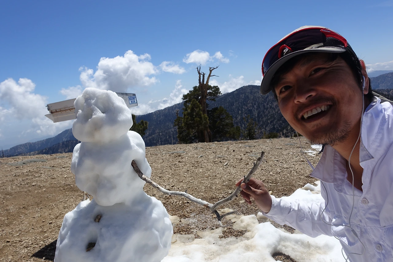 억겁의 세월을 홀로 보내고 있는 노송을 뒤로하고 오른 정상에서는 광활한 Mojave desert가 한 눈에 내려다볼 수 있었고, 아직 녹지 않은 눈들 위에 누가 만들었는지는 모르지만 태양에 맞서 힘겨운 싸움을 하고 있는 올라프가 우뚝하게 서 있었다. Mt. Baden-powell 정상에서 굽어보는 주변의 경관은 너무나 아름다웠다.