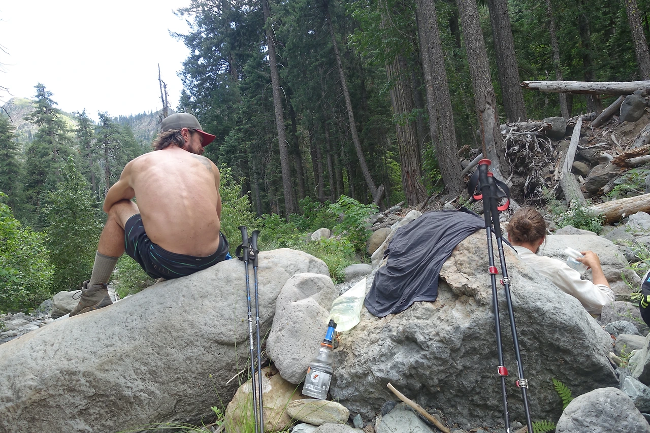 여기까지 오느라 땀도 많이 흘렸겠다 웃통을 훌러덩 벗고는 보기만 해도 시원한 계곡물에 몸을 담갔다. 뼛속까지 파고드는 차가움에 오래 있지도 못하고 10초도 안돼서 뛰쳐나올 수밖에 없었다. 머릿속까지 맑아지는 기분에 개운함을 느끼고는 벗어 둔 땀에 절은 셔츠를 물속에 넣고 이리저리 흔들었다. 물을 정수하고 있는 Phish 옆에 앉아 담배를 한대 말아서 입에 물고는 라이터를 찾았는데 아뿔싸! 셔츠의 가슴 포켓에 넣어둔 걸 깜박하고는 물에 담갔던 게 생각이 났다. 당연 셔츠 주머니에는 라이터가 없었고, 셔츠를 담갔던 곳을 찾아봤지만 라이터는 흔적도 없이 사라지고 말았다. 망연자실한 표정으로 세상을 다 잃은듯한 슬픔을 느끼고 있는데, 트레일을 따라오고 있는 한 무리가 보였다. Thunder bunny였다. 뒤로 나이가 좀 있는 듯한 여성 하이커와 어제 본 Wildman도 따라오고 있었다.